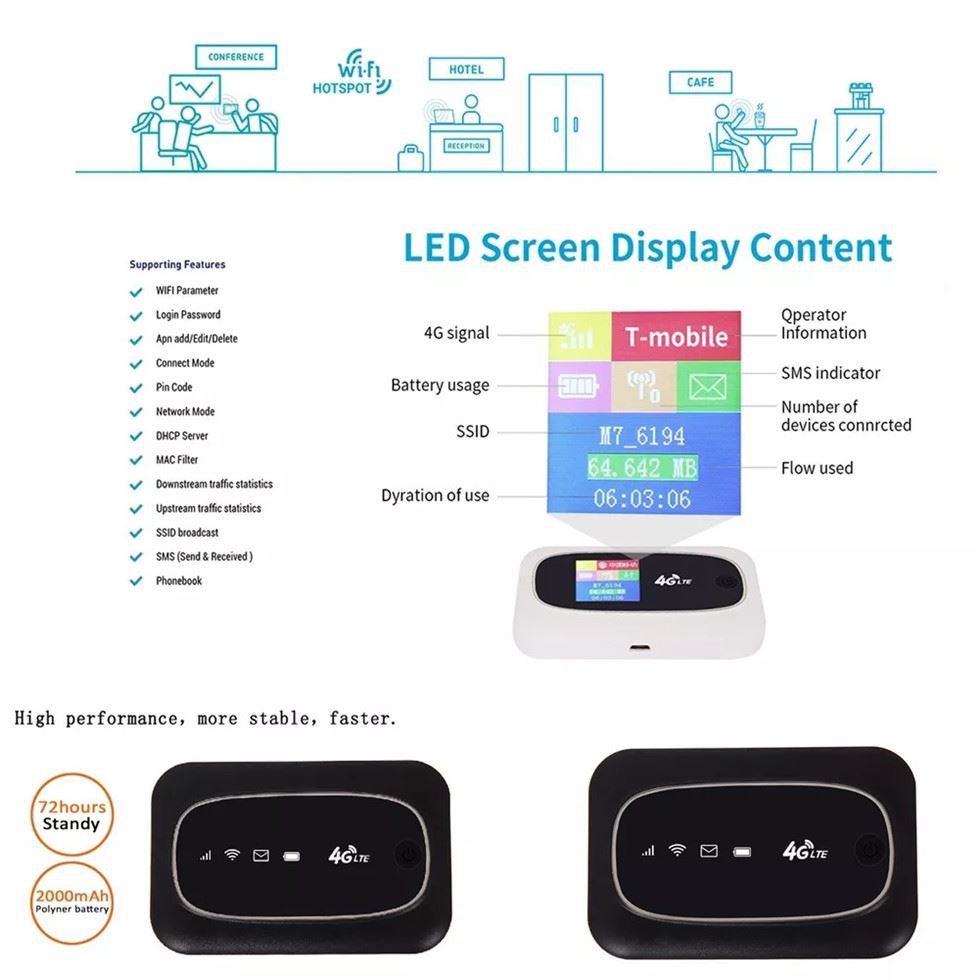 Ini mendukung layanan akses jaringan seluler 4G/3G/2G. Hingga 10 pengguna berbagi data 4G dengan WIFI saluran ganda secara bersamaan. MDM9207 memiliki kinerja yang lebih Stabil dan daya yang Lebih Rendah, Waktu kerja baterai hingga 10 jam, siaga 48 jam. Bahasa Inggris/Perancis/Jerman/Spanyol/Portugis/Bahasa Arab didukung, tim RD dan milik pabrik memberi Anda dukungan teknis penuh dan layanan OEM.